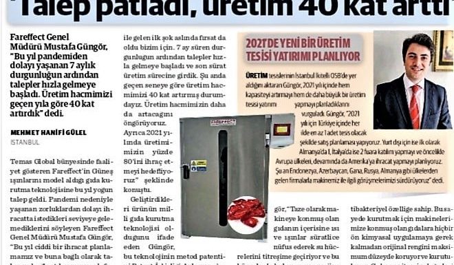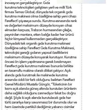 Fareffect Damak Dergisi Haberi 06/12/2020 GIDA KURUTMADA YERLİ VE MİLLİ TEKNOLOJİ FAREFFECT Tarımın sanayiye entegre olmasını konuşuyorsak; milli ve yerli üretime sahip Türk girişimcisi gıda sağlığında inovasyon gerçekleştiriyor. Gıda kurutma teknolojileri geliştiren yerli ve milli Türk firması #TemasGlobal Dünyada tek organik gıda kurutma makinesi özelliğine sahip Fareffect Gıda Kurutma Makinesi, teknolojisi gereği gıdanın yapısal özelliklerini maksimum düzeyde […]