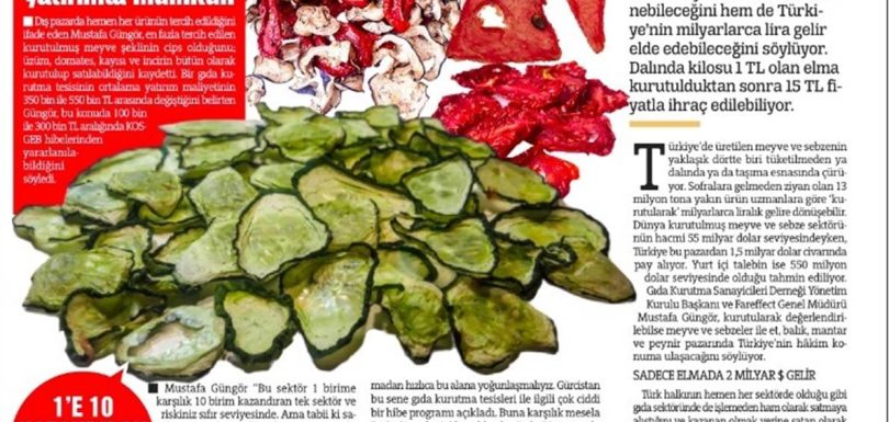 GKSD – Yenişafak Gazetesi Haberi 09/11/2020 Kurutulmuş gıda sektörünün dünya da 55 milyar dolarlık bir hacmi olduğunu belirten Gıda Kurutma Sanayicileri Derneği Genel Başkanı Mustafa Güngör “Türkiye’nin bu pazardaki payı 1.5 milyar dolar. Türkiye meyve sebze cenneti. Topraklarımızda yetişen gıdaları kurutarak ekonomiye ek kaynak sağlayabiliriz” dedi. Türkiye meyve – sebze cenneti. Genel olarak yaş satılıyor […]